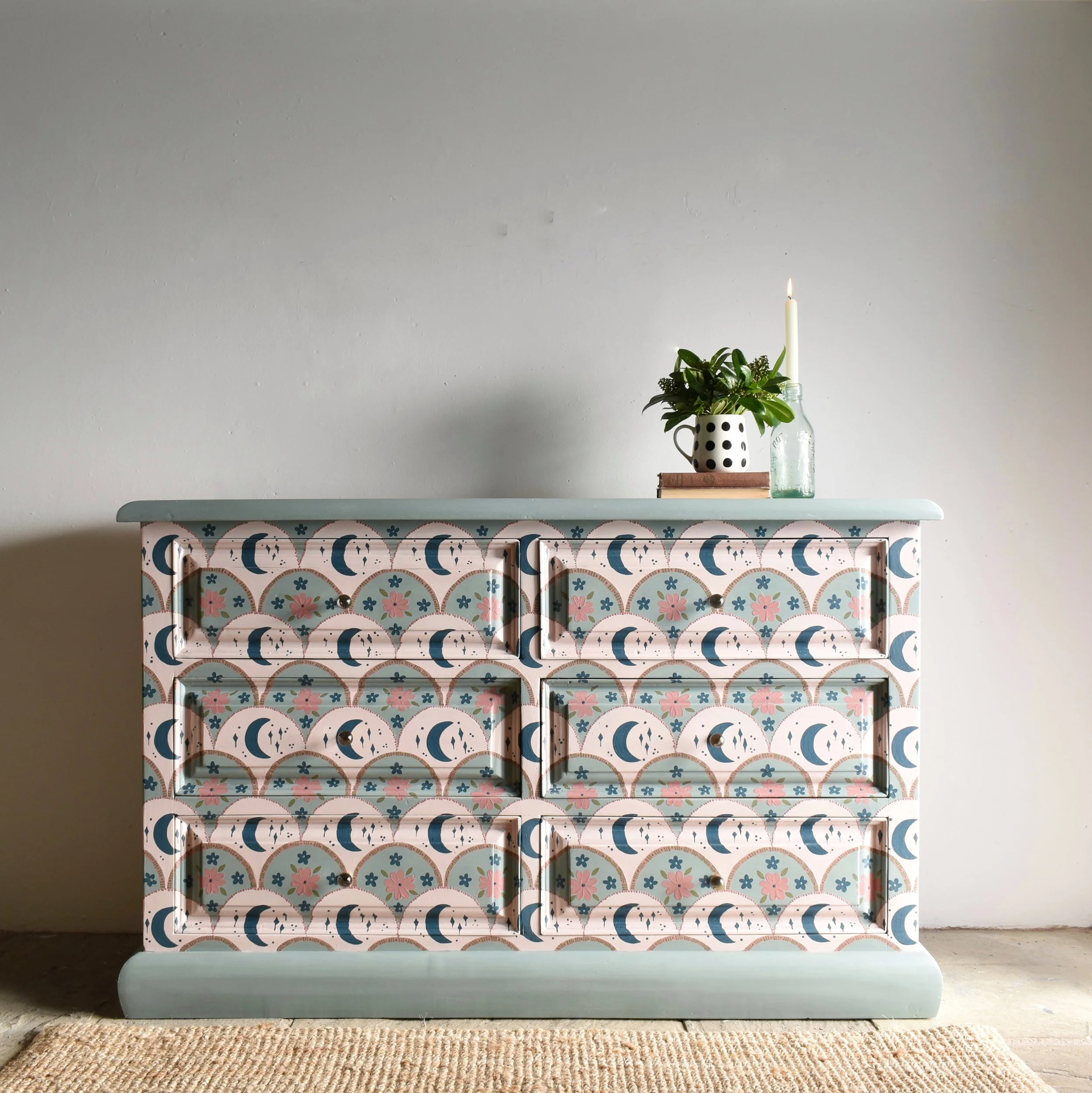 Combining my love of folk and the night sky felt like putting on a my favourite slippers. With trepidation I painted my first piece as part of my Annie Sloan residency whereby I imagined capturing elements of the sky and putting them in a vase of flowers to be enjoyed by candlelight. They sold straight away to a fellow night sky dreamer. Magic!